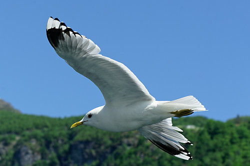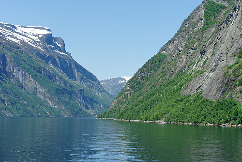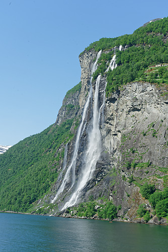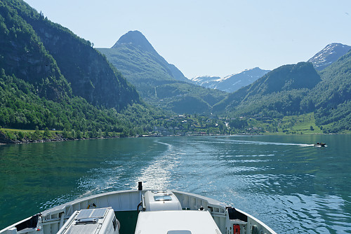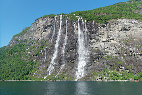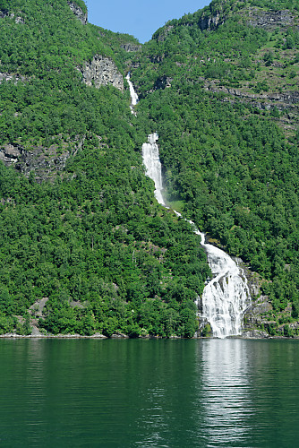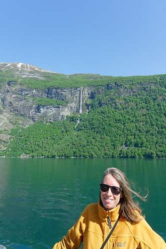 Am nächsten Tag fahren wir mit der Fähre durch den Geirangerfjord in Richtung der Vogelinsel Runde und sehen mehrere Wasserfälle und eine Möve, die uns ein Stück begleitet.