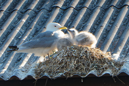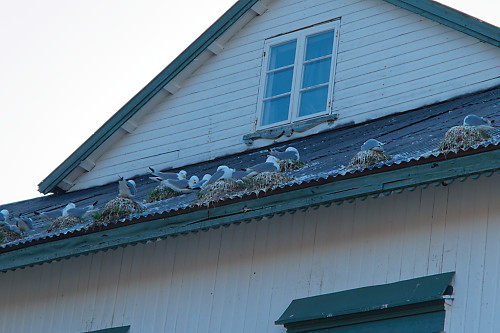 Norwegen ohne Möwen - das gibt es nicht. Hier in Å haben sie ihre Nester mit ihren Jungen auf den Dächern der Häuser.