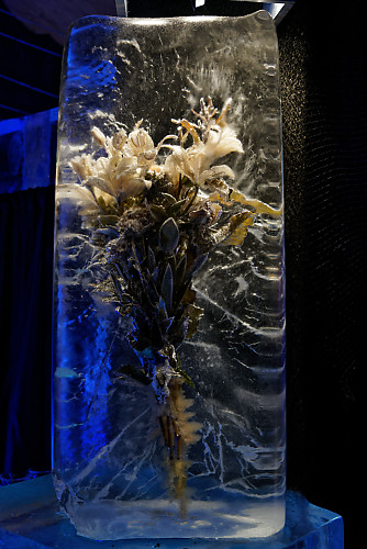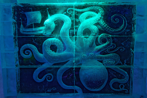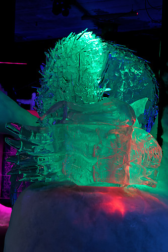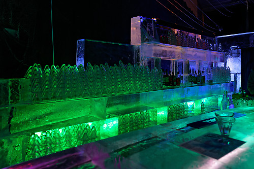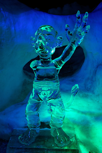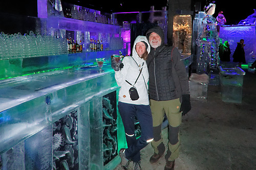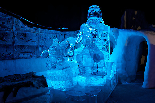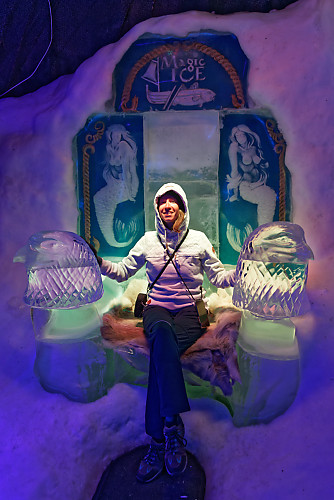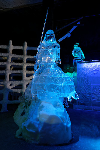In Svolvær gibt es in einer alten Fischkühlhalle eine Ausstellung von Eisskuplturen und eine Ice-Bar (Drink inkludiert).