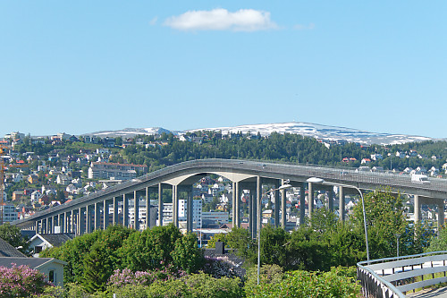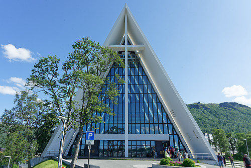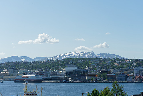 Mit Tromsø erreichen wir unseren letzten Stop in Norwegen und auch den nördlichsten Punkt unserer Reise. Tromsø liegt auf einer Insel und hinter der Stadt ragen die schneebedeckten Berge auf.