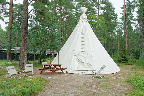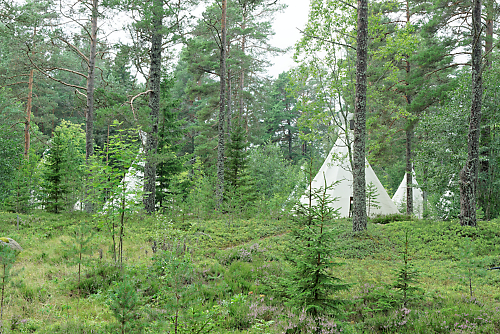 Das Wetter ist unbeständig und so entschließen wir uns nur für eine kleine Wanderung durch den an der Küste liegenden Wald an den Strand. Der Rückweg führt uns durch einen Campingplatz, der auch Tipis als Unterkunf anbietet.