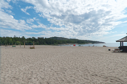 Hier finden wir einen wunderschönen Sandstrand und einen Stellplatz beim Kiefernwald, der